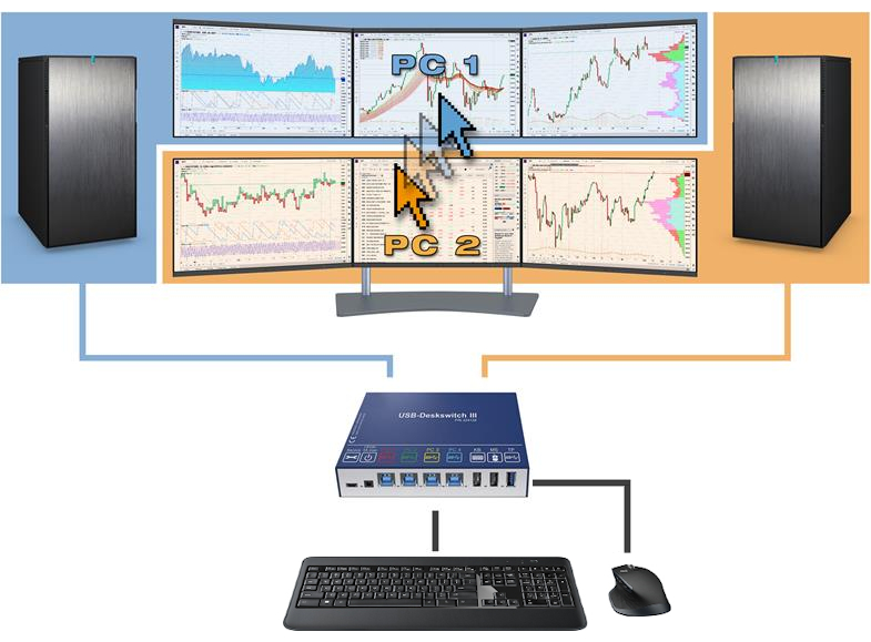 Dank des USB-Deskswitches wird automatisch erkannt, welcher Monitor gerade im Fokus steht. Bewegt sich der Mauszeiger an den Bildschirmrand, wechselt die Steuerung nahtlos auf den nächsten PC samt angeschlossener Monitore. Ein manuelles Umschalten zwischen verschiedenen Systemen entfällt vollständig.
